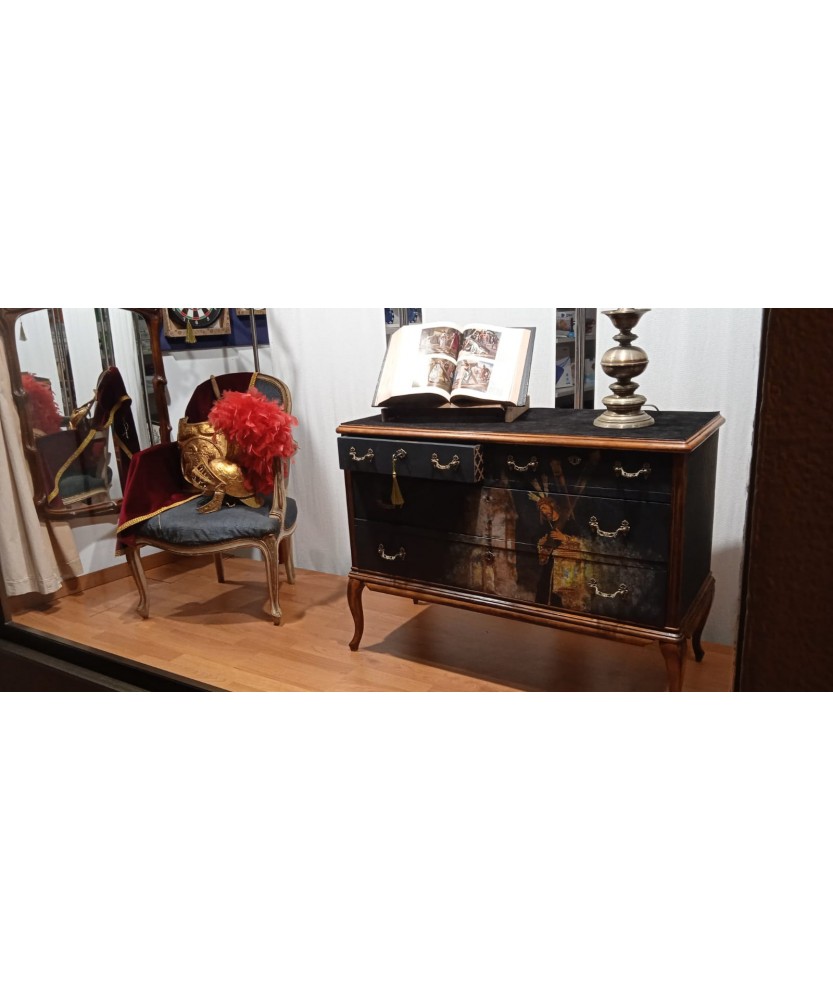 Cómoda de madera pintada en color negro azulado. Se ha decorado con imagen impresa del Cristo del Gran Poder y pintura al oleo. Un lateral se ha decorado con cenefa realizada en pan de oro inspirada en el bordado de la túnica del Cristo. En el otro lateral se ha incorporado una cenefa en tonos dorados. El interior de los cajones se ha forrado en tela aterciopelada de color negro al igual que el sobre de la cómoda.