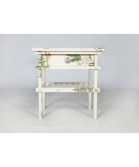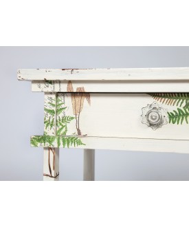 Decorada con la técnica de decoupage con motivos de hojas en tonos verdes que le aportan frescor y luminosidad tanto a la pieza como a la instancia donde se coloque.